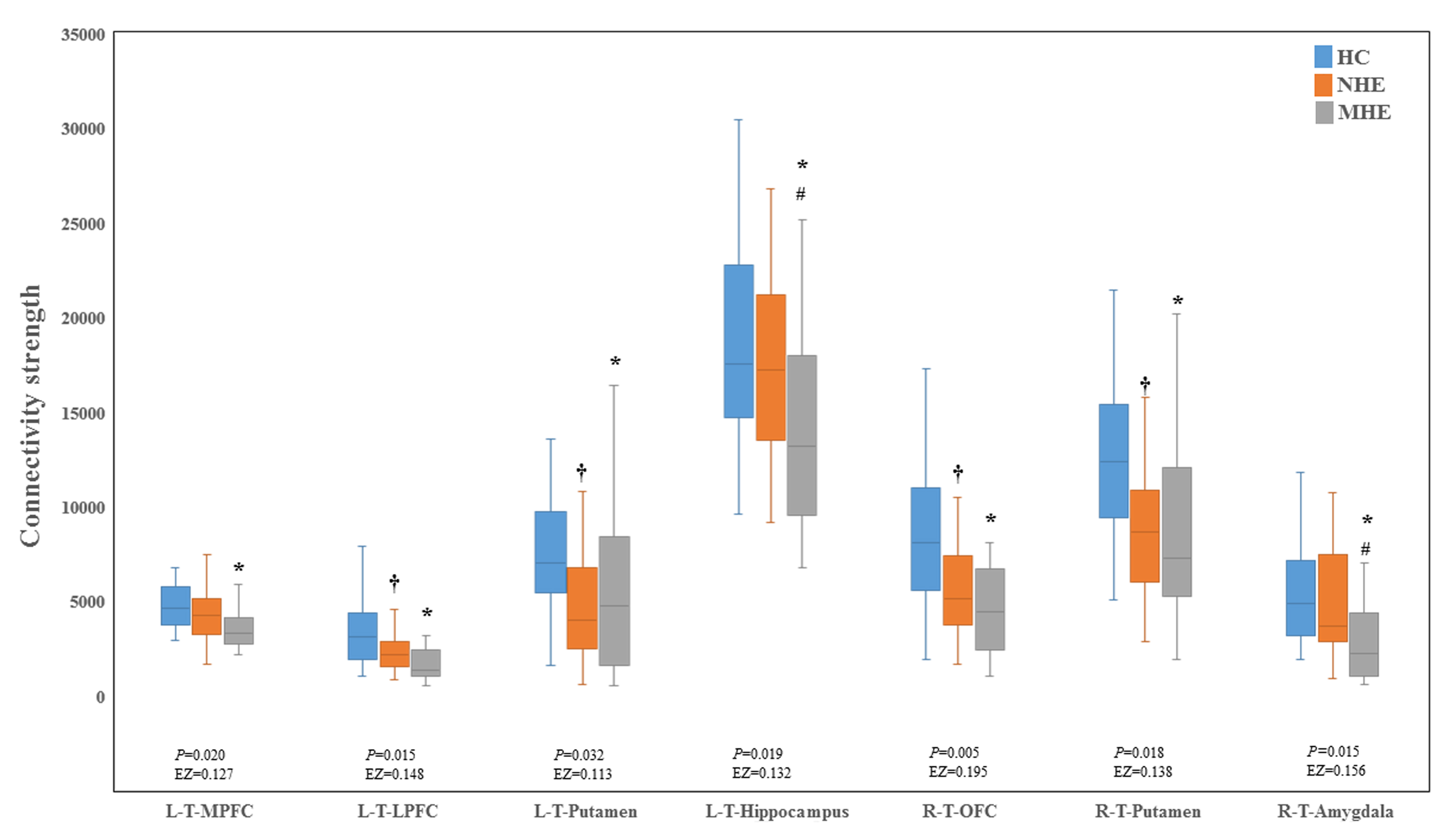 Figure 3. Between-group difference in connectivity strength. The markers *, †, and # respectively represent