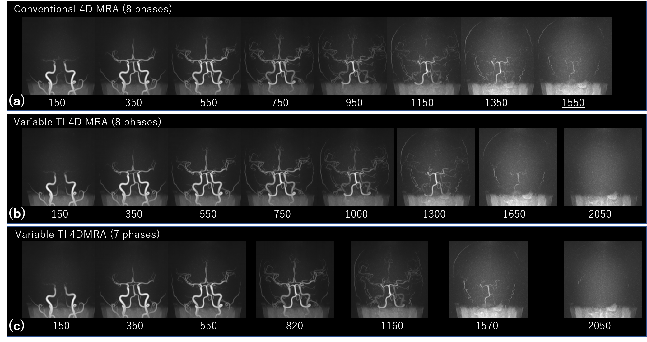MRA with 8 phases, which has longer TI in late phase. (c) VTI UTE 4D MRA with 7