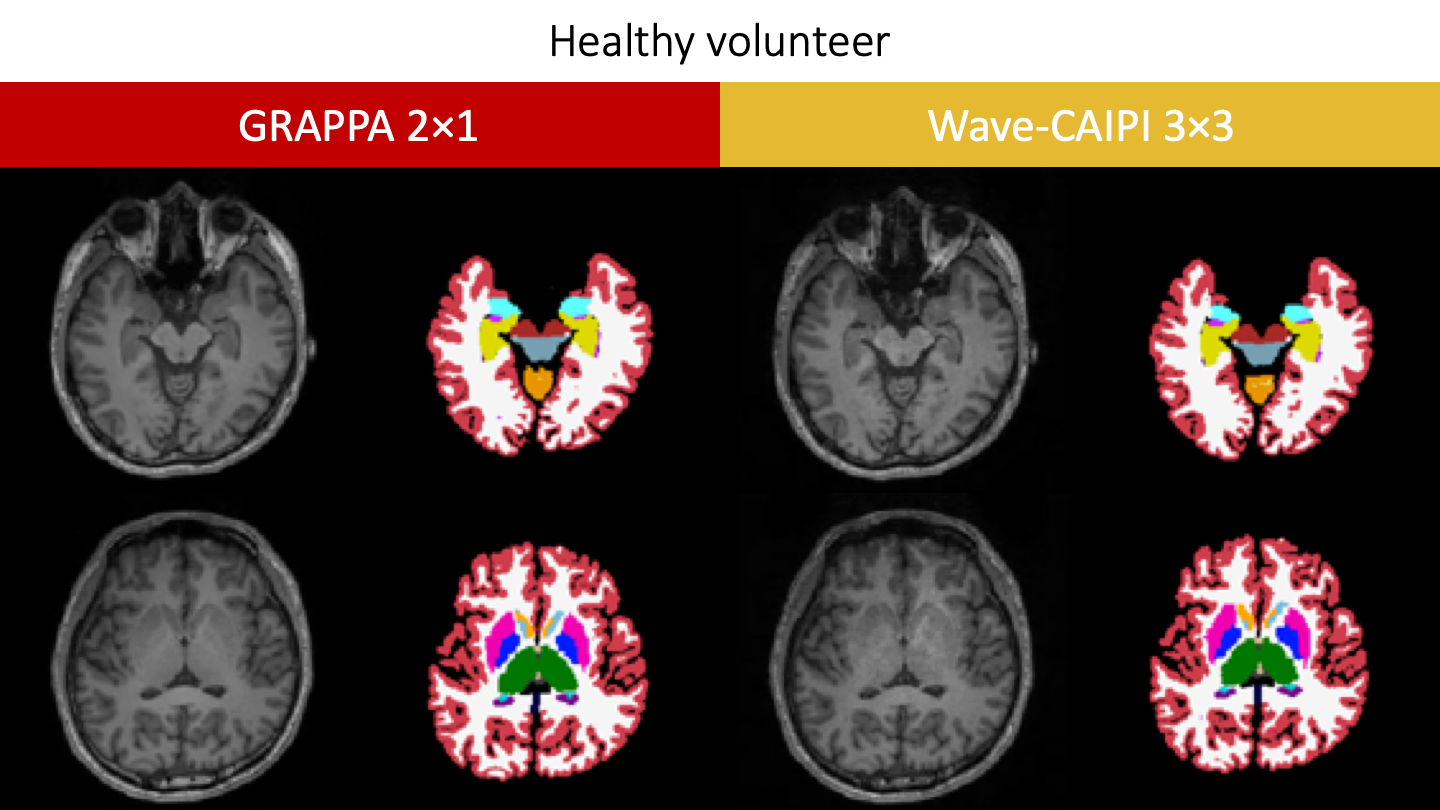 scanner. MPRAGE with Wave-CAIPI 3×3 shows relatively good contrast and reliable automated segmentation results despite its short scan time.