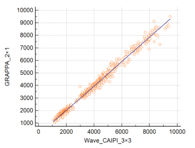 The correlation of all VOIs between GRAPPA 2×1 and Wave-Caipi 3×3 was 0.991 [0.989 - 0.992].