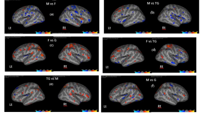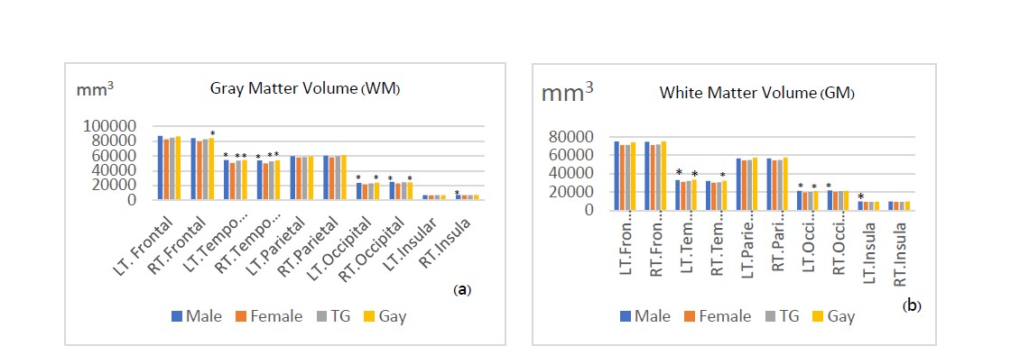 Fig.1 (a) Gray Matter (GM) volume, and (b) White Matter (WM) volume compared between Male (M), Female (F), Transgender women (TG) and Gay men (G).