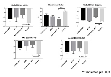 Figure 2: Hypertrophic ventricular noncompaction groups showed more remarkable differences with normal controls in both global and segmental levels.