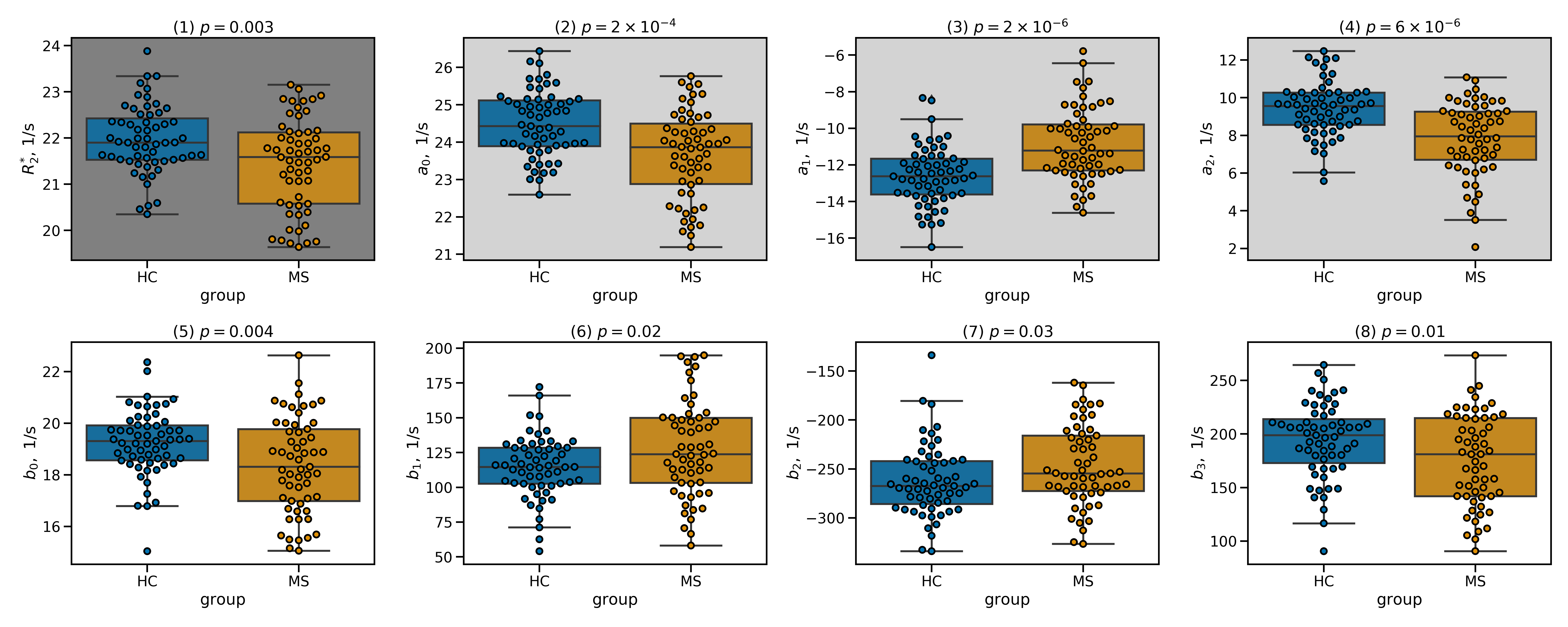 Figure 4: (1) Median R2* across the entire NAWM for healthy controls (HC) and MS patients (MS). The upper row (2–4) shows the coefficients of model 1 and the lower row (5–8) displays the coefficients of model 2 for both groups. Each dot represents one subject.