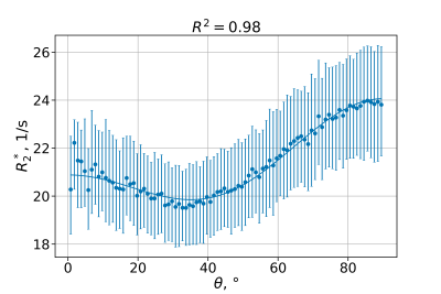 Figure 2: Orientation dependency of R2* in NAWM of an MS subject. Dots are median values within 1°-wide bins, error bars are interquartile ranges. Solid line is the fit of model 1.