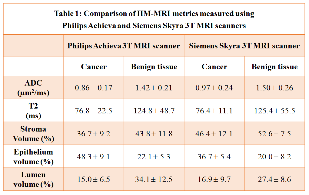 and T2 (87.5 ms) compared to surrounding benign tissue. HM-MRI correctly
