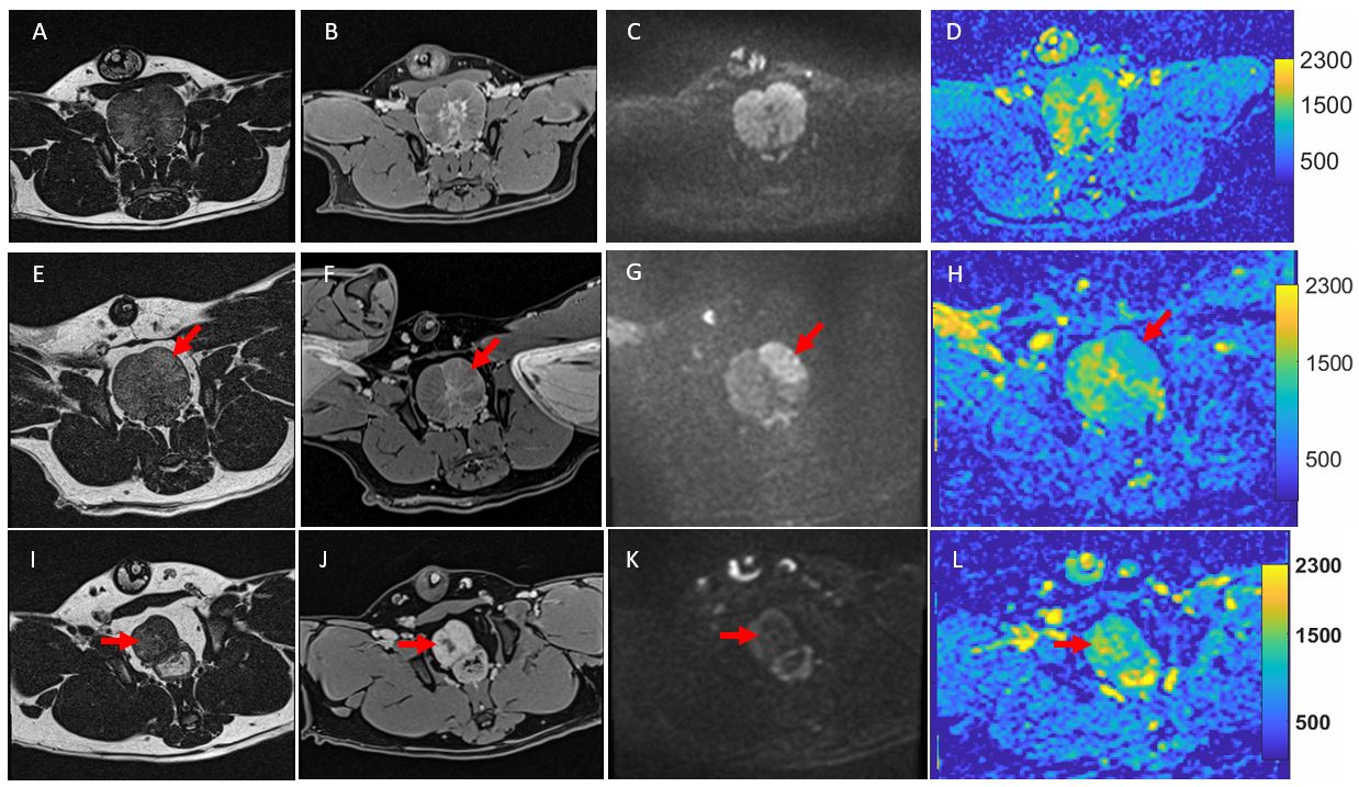(C, G, K); and ADC maps in 4th column (D, H, L). Arrows point to the