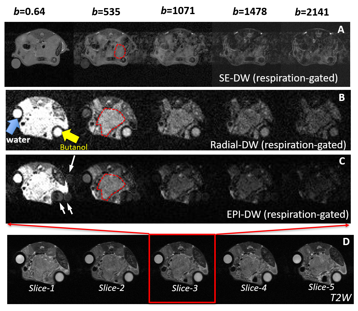 DW-MR images obtained from respiration-gated SE- (A), Radial- (B) and EPI-DW (C) protocol using indicated b-values. White arrows in A point to motion artifacts at b=500 and above and to ghosting artefacts in EPI-DW images (C). Red frame and arrows in D indicate that of the five T2W images, slide-3 corresponds to DW-images displayed in B and C with different b-values. DW-images in A are from a different mouse.