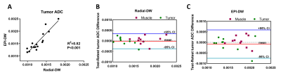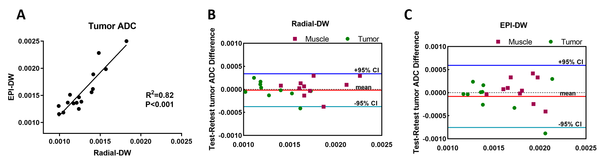 The tumor ADC values measured from Radial- and EPI-DW are highly correlated (A) (r2=0.82). Bland-Altman plots of tumor and muscle ADC value between test and retest data were shown for Radial-DW (B) and EPI-DW (C) protocol. More details in Table 1.
