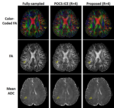 and color-coded FA maps from our proposed reconstruction are closer to those