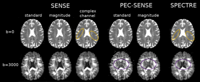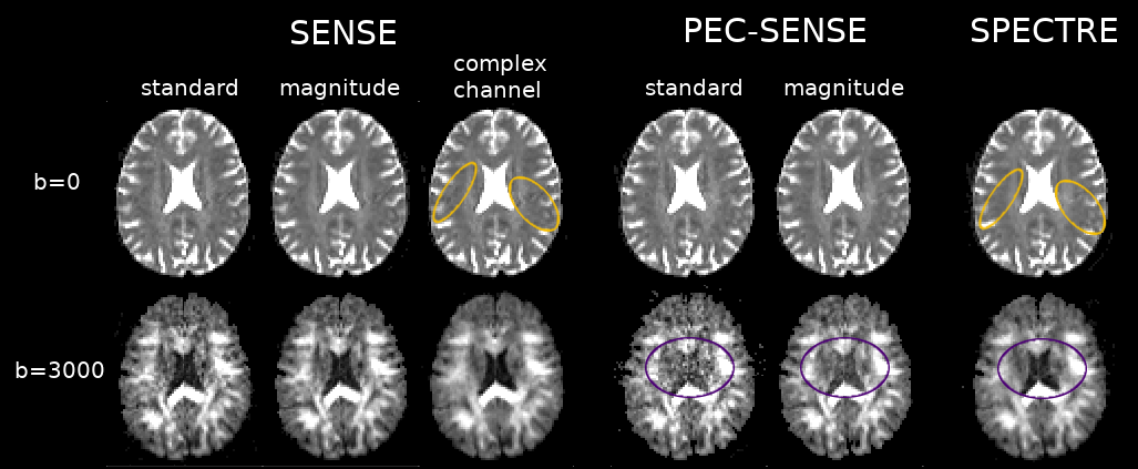 Fig. 2. Ghosting artefacts were visible in the SENSE reconstructions (left, yellow outline), while noise amplification was present at high b-values in the standard and magnitude PEC-SENSE reconstructions (middle, purple outline). Denoising complex channel data during a 2D phase-corrected reconstruction both mitigated ghosting artefacts (right, yellow outline) and limited noise propagation (right, purple outline). Note the noise-floor was also significantly reduced in complex channel denoised data (CSF in purple outlined region, right).