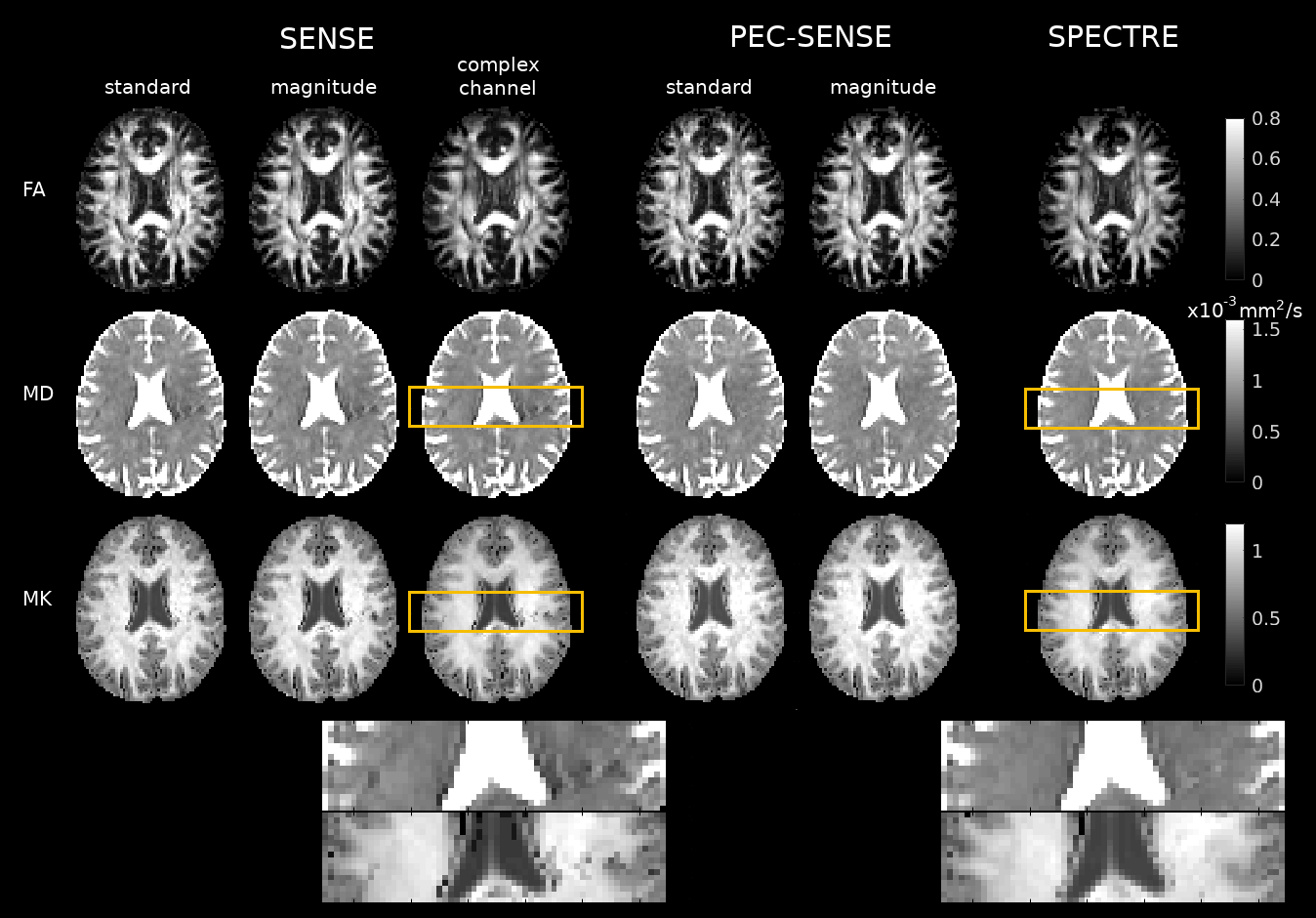 Fig. 3. Residual ghosting in SENSE reconstructions introduced appreciable local biases into MD and MK maps (left, yellow zoomed regions). Phase correction in PEC-SENSE removed biases from ghosting (right, yellow zoomed regions); however, MK estimates in standard and magnitude denoised PEC-SENSE reconstructions appeared inflated on visual inspection. These noise-related biases in MK were less apparent in SPECTRE.