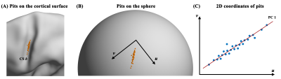 reduction of coordinates of sulcal pits. (A) sulcal pits (orange spheres) in