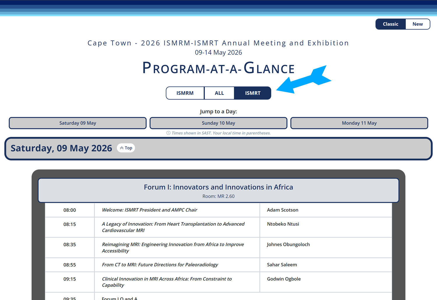 The blue arrow indicates the button to change the visible content: ISMRM, ISMRT, or both (all).